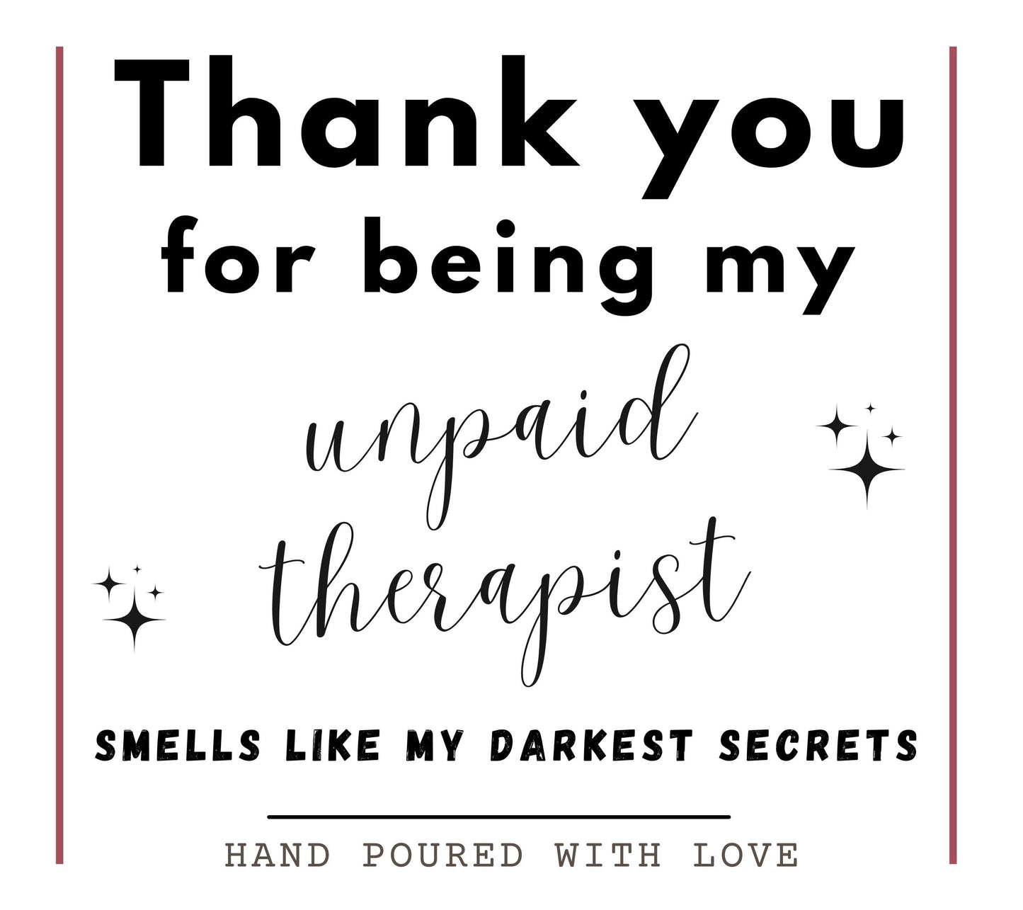 Looking for the perfect mix of humour and heart? Our "Thank You for Being My Unpaid Therapist" candle is the ultimate funny gift for best friends, coworkers, or anyone who’s been your go-to confidant. Whether it’s a Christmas funny gift for her, a birthday present, or just a thoughtful friend gift to say "I appreciate you," this candle is a hilarious way to show your gratitude.